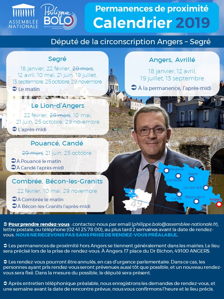 | Angers | > Les rendez-vous se tiendront à la permanence parlementaire située à Angers. Aucun calendrier n’est associé à ces permanences. |